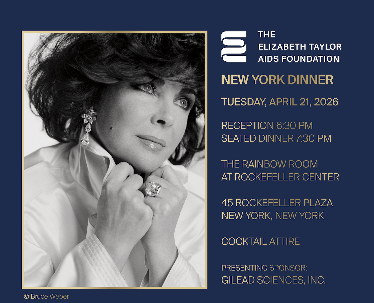 The Elizabeth Taylor AIDS Foundation New York Dinner 2026 April 21, 2026 Rainbow Room at Rockefeller Center 30 Rockefeller Plaza 65th Floor New York, New York